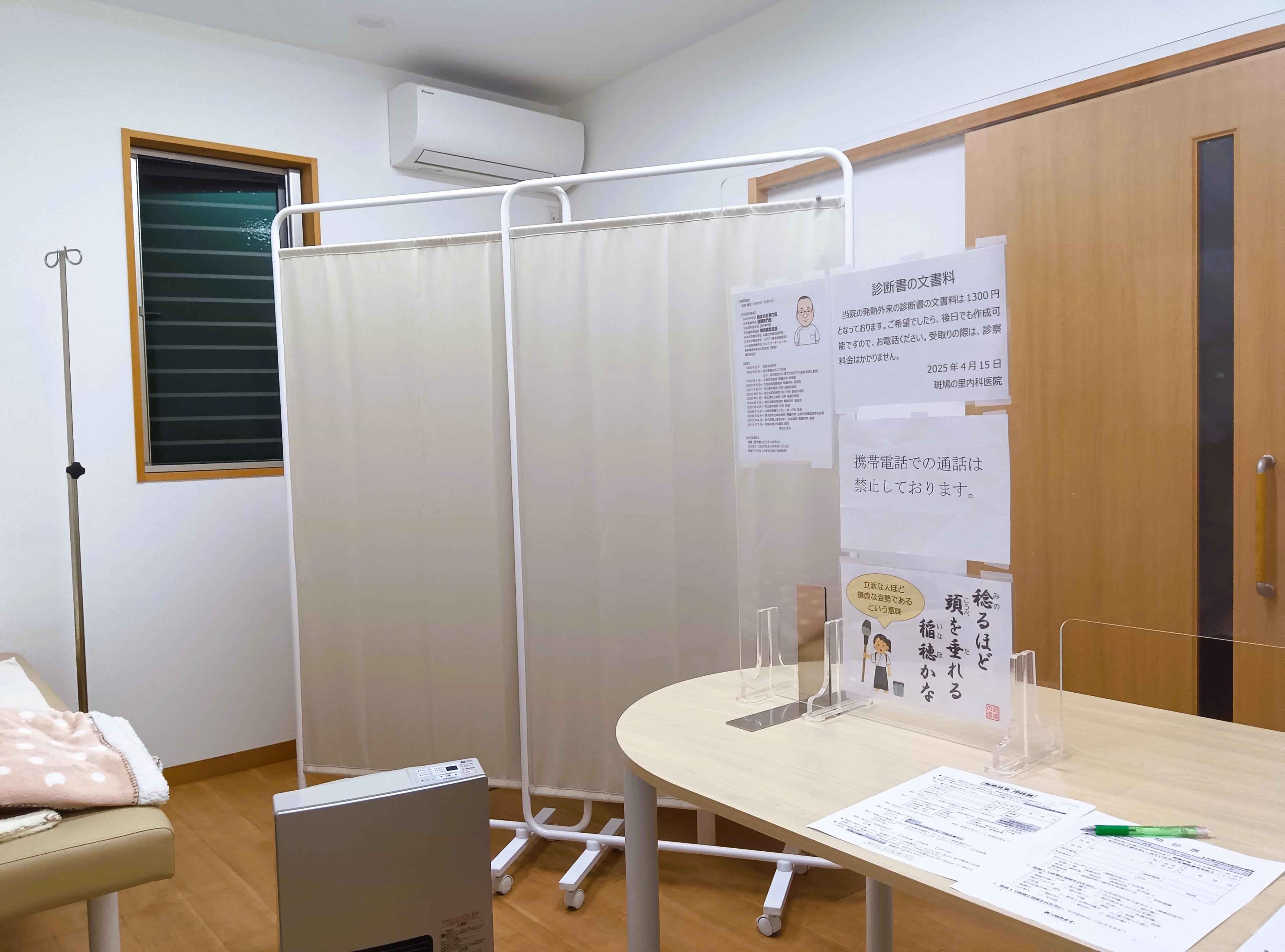 以下の写真は、当院の発熱外来の診察室です。換気を確保した清潔な環境で、診察や検査を行います。